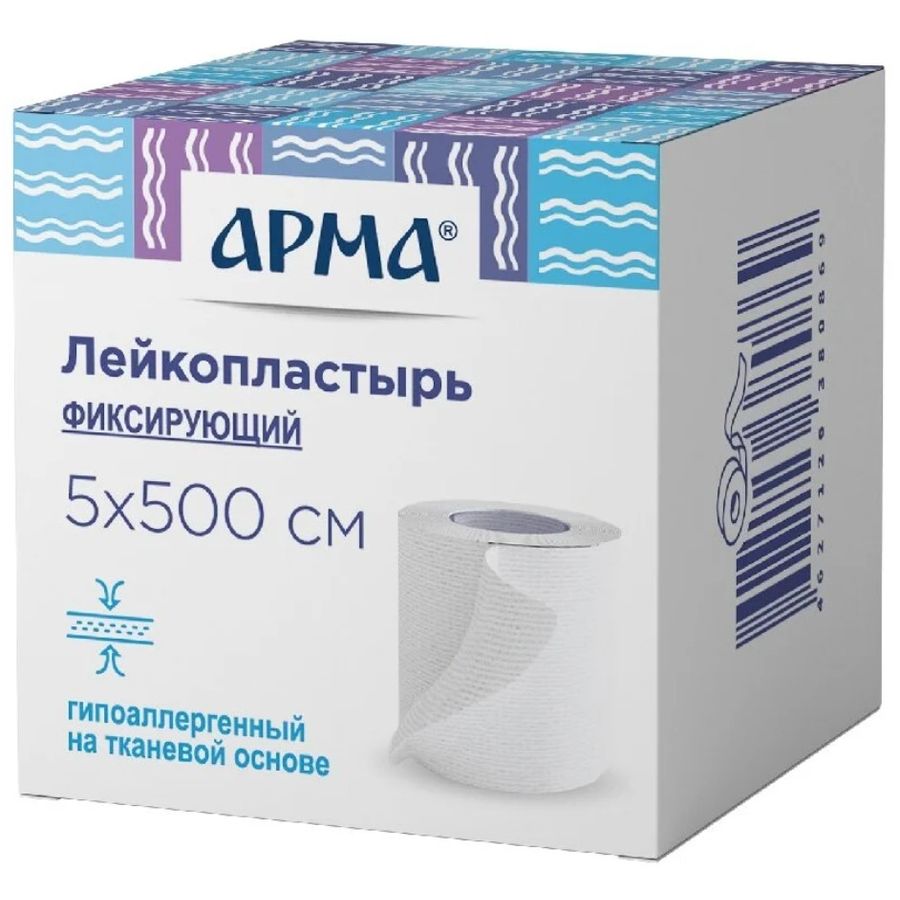 Фиксирующий Лейкопластырь Арма на тканевой основе предназначен для фиксации повязок или закрепления предметов медицинского назначения (тампонов, компрессов, повязок, зондов и катетеров). Лейкопластыри Арма изготавливаются с применением медицинского гипоаллергенного клея на основе синтетического каучука. Пластырь надежно фиксируется благодаря высокой механической прочности, но снимается, не травмируя кожу и не оставляя следов клеевой массы на коже.
