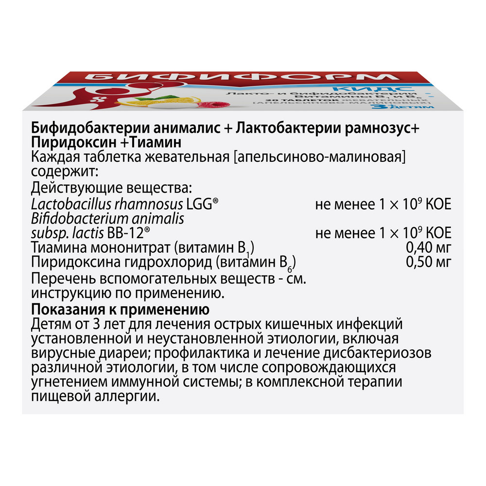Активные вещества: Lactobacillus rhamnosus (L. rhamnosus GG) ≥ 109 бактерий; Bifidobacterium animalis (Bifidobacterium Bb-12) ≥ 109 бактерий; Тиамина мононитрат (Витамин B1) 0,40 мг; Пиридоксина гидрохлорид (Витамин В6) 0,50 мг;