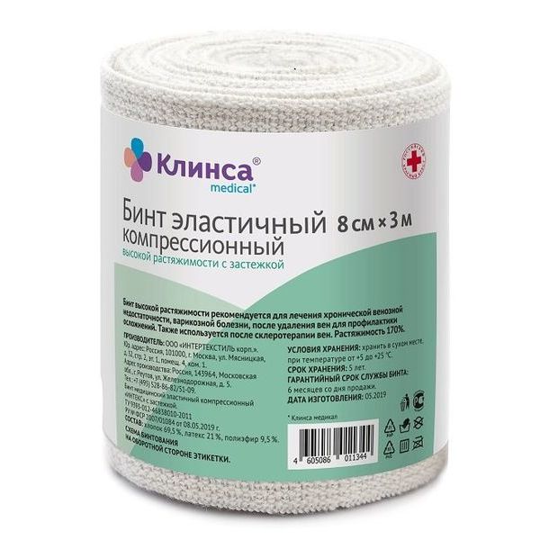 - Бинт эластичный компрессионный высокой растяжимости с застежкой 8х300см Клинса