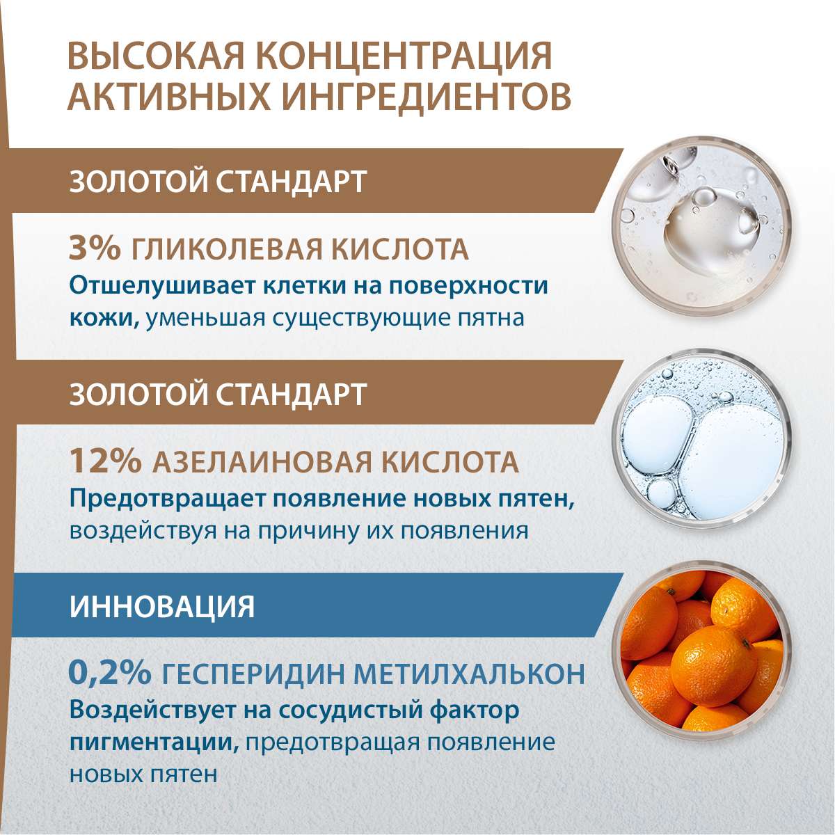 Эффективность депигментирующего действия обусловлена его инновационным составом, включающим концентрированную азелаиновую кислоту и гликолевую кислоты: