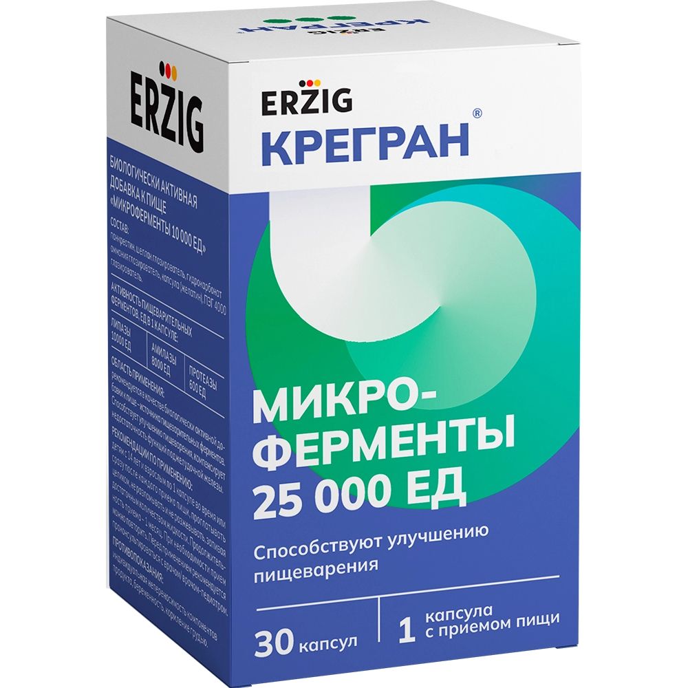ERZIG КРЕГРАН МИКРОФЕРМЕНТЫ 25 000 ЕД - Биологически активная добавка (БАД) к пище - комплекс ферментов (энзимов) для компенсации недостаточности функций поджелудочной железы.