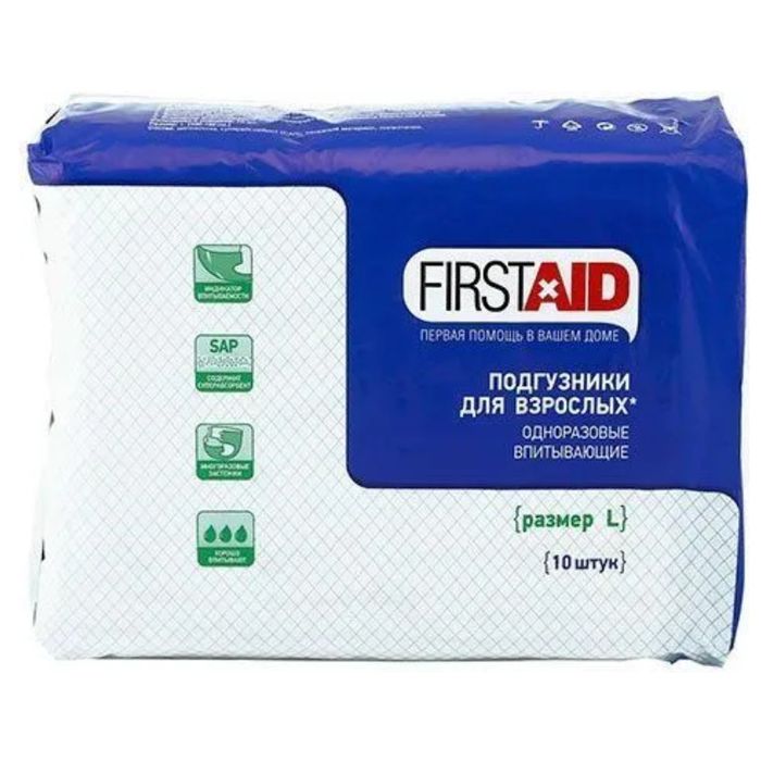 В некоторых жизненных ситуациях подгузники для взрослых просто необходимы. Они используются не только для ухода за лежачими больными, но и людьми, перенесшими операцию, страдающими недержанием мочи разной степени. First Aid Euron Памперсы для взрослых одноразовые при средней степени недержания размер L №10 состоят из нетканого материала. Впитывающие трусы предназначены для защиты при средней и тяжелой степени недержания и удобны для малоподвижных и лежачих больных. Памперсы для взрослых изготовлены из паропроницаемого суперабсорбента, боковые части — из нетканого материала. Предусмотрена эластичная резинка, боковые бортики от протекания, двойной впитывающий слой. Подгузниками от First Aid помогут решить деликатные проблемы!