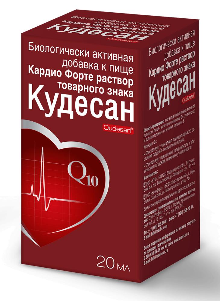 Кардио Форте раствор товарного знака Кудесан является источником коэнзима Q10, который рекомендован для профилактики и в комплексной терапии заболеваний сердечно-сосудистой системы, используется при синдроме хронической усталости, борется с возрастными изменениями.