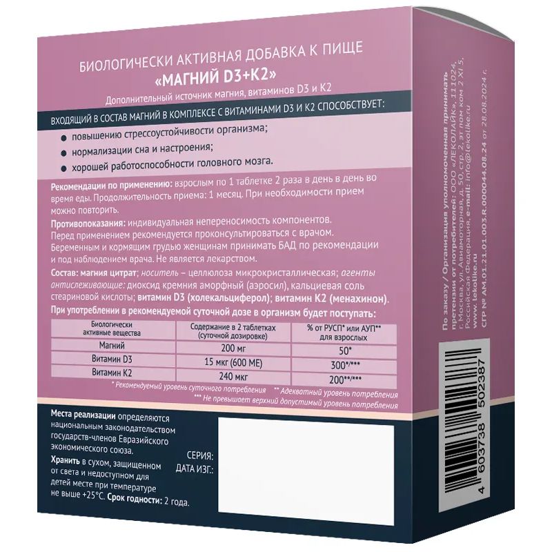 Биодобавка Магний Д3+К2 от компании ЛЕКОЛАЙК содержит магний в составе цитрата магния, усиленный витаминами Д3 и К2. Действуя в комплексе, магний с витаминами Д3 и К2 работают в унисон, усиливая действие друг друга.