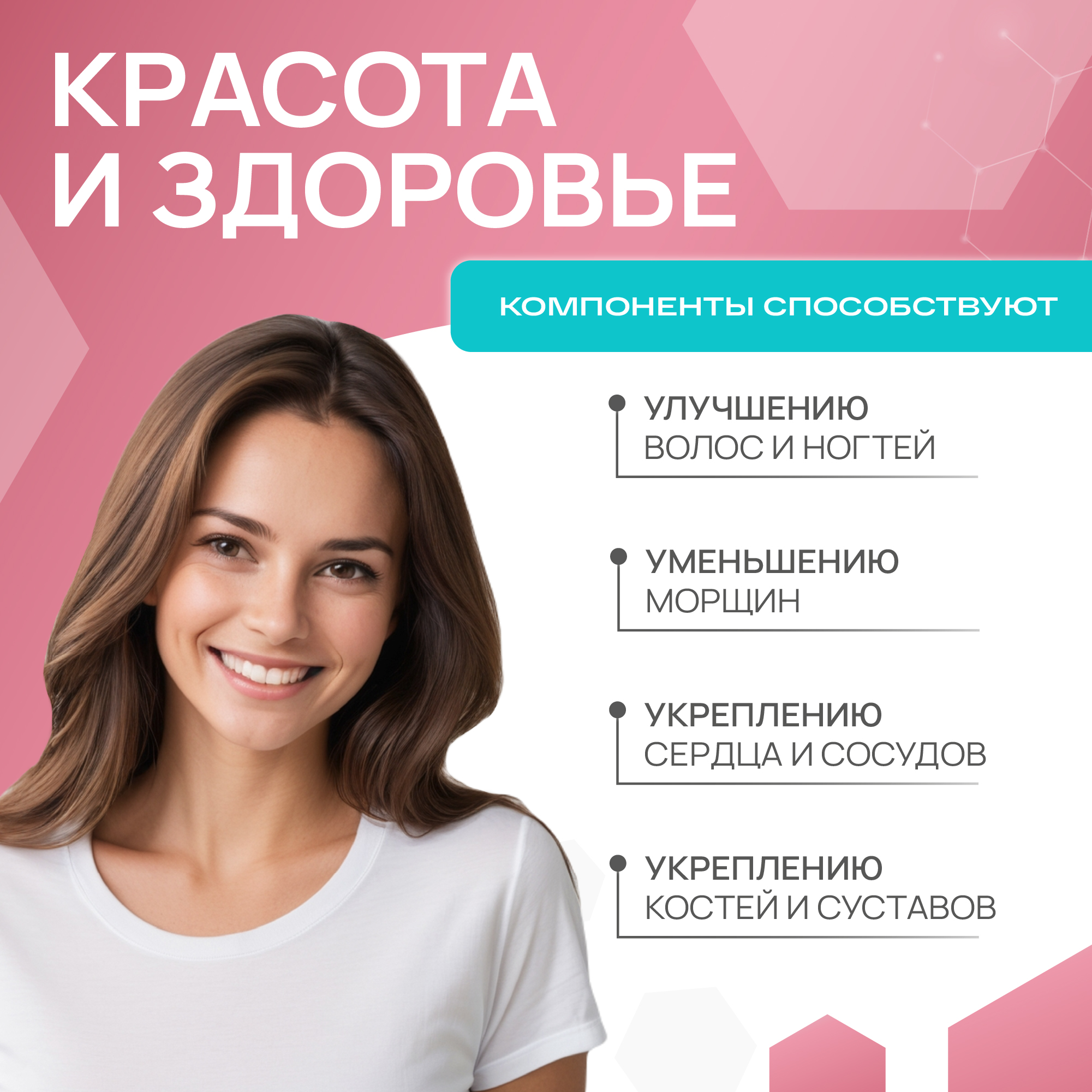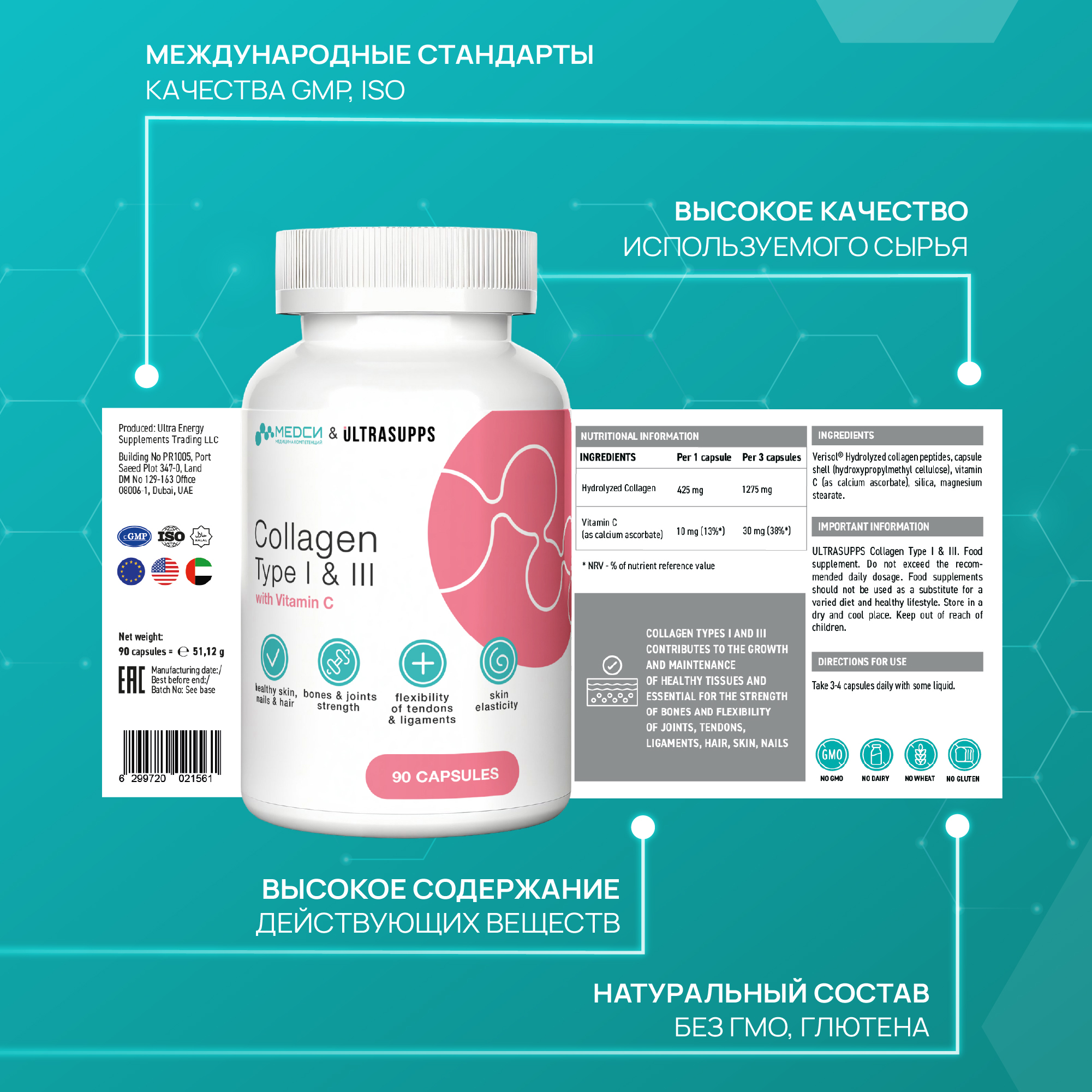 Пептиды гидролизованного коллагена говядины - 425 мг, витамин С (в форме L-аскорбата кальция) - 10 мг, оболочка капсулы (Е460 целлюлоза), диоксид кремния (носитель), стеарат магния (стабилизатор).Условия и сроки хранения