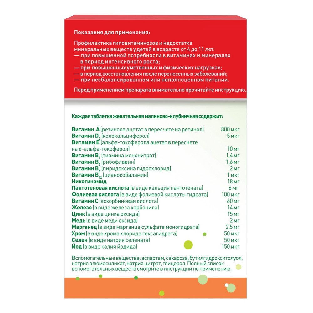 Вспомогательные вещества: ксилит; МКЦ; кальция гидрофосфата дигидрат; крахмал кукурузный; кислота аскорбиновая; метилцеллюлоза; желатин; кремния диоксид коллоидный безводный; кислота стеариновая; кислоты лимонной моногидрат; смесь моно-, ди- и триглицеридов; аспартам; вкусовой наполнитель (малиново-клубничный, апельсиново-ванильный, банановый, фруктовый или кола с лимоном); вода очищенная