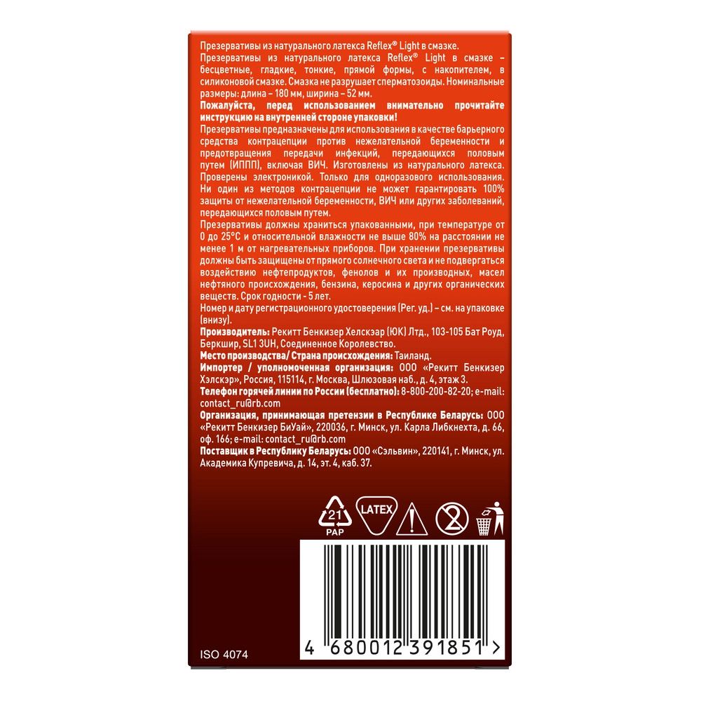 Презервативы из натурального латекса Reflex Light в смазке - тонкие, бесцветные, гладкие, прямой формы, с накопителем, в силиконовой смазке.