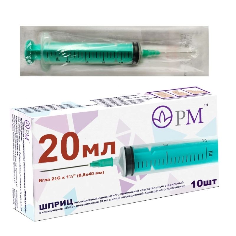 - Шприц трехдетальный 20мл игла 21G 0,8x40мм N10 Премьер-Мед