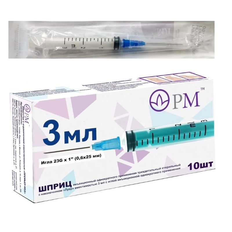 - Шприц трехдетальный 3мл игла 23G 0,6x25мм N10 Премьер-Мед