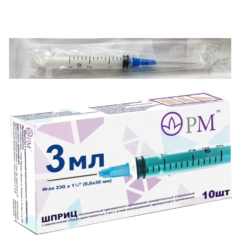 - Шприц трехдетальный 3мл игла 23G 0,6x30мм N10 Премьер-Мед