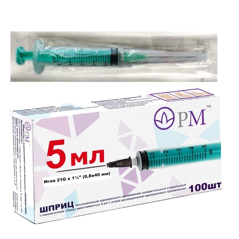 - Шприц трехдетальный 5мл игла 21G 0,8x40мм N100 Премьер-Мед