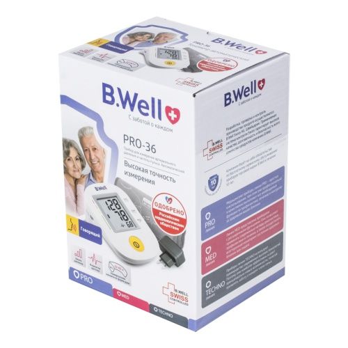Автоматический тонометр B.Well PRO-36 озвучивает процесс и результат измерения. Прибор имеет продуманный дизайн, он удобен и прост в использовании. Для измерения давления достаточно нажать одну большую яркую кнопку. PRO-36 имеет память последнего измерения, регулировку громкости и шкалу-подсказку, которая поможет оценить уровень давления.