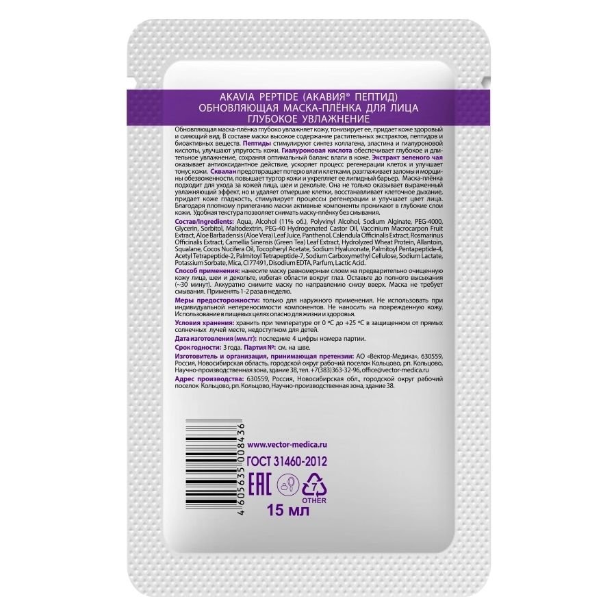 Акавия Пептид Маска-пленка для лица глубокое увлажнение обновляющая 15мл