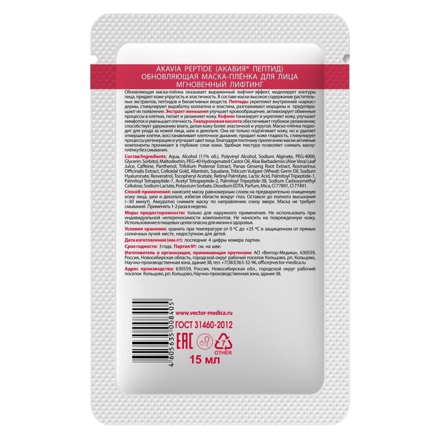 Акавия Пептид Маска-пленка для лица мгновенный лифтинг обновляющая 15мл