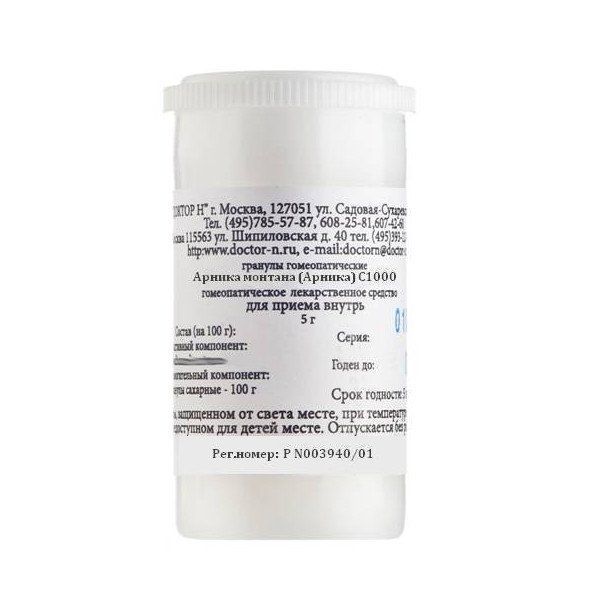 Активное вещество:Arnica montana (Арника монтана) C1000 - 1,0 г;