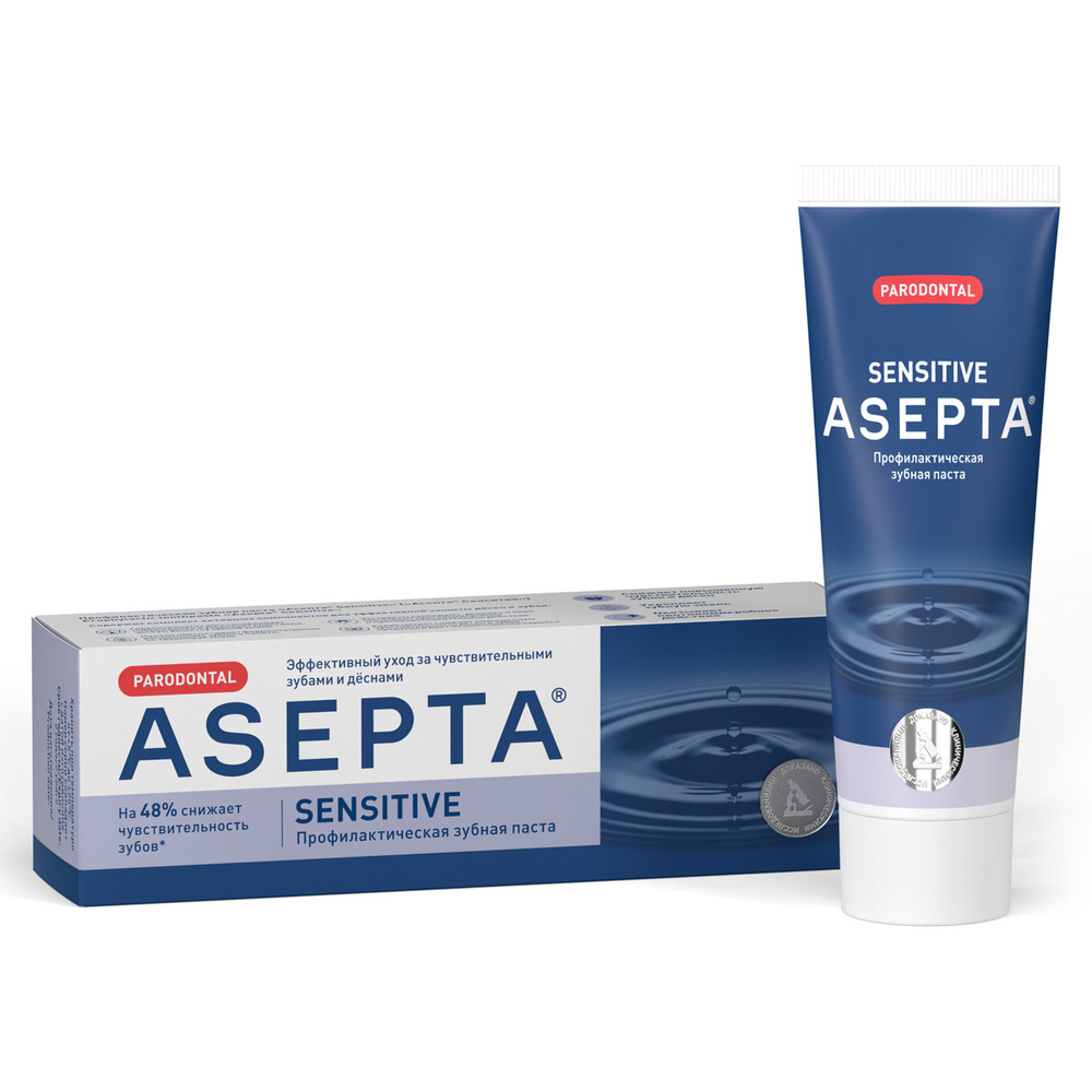 Лечебно-профилактическая зубная паста "Асепта Sensitive": снижает повышенную чувствительность зубов; укрепляет зубную эмаль и защищает зубы от кариеса; обладает антибактериальным действием; снимает воспаление и кровоточивость дёсен; удаляет зубной налёт и препятствует его дальнейшему образованию; освежает дыхание.