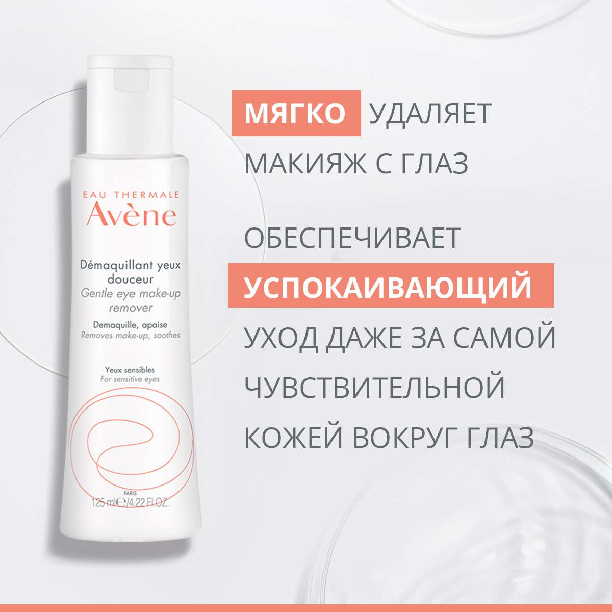 Удаляет макияж: не содержит агрессивных очищающих компонентов. Идеально, не повреждая, удаляет макияж с ресниц и век. Успокаивает: Термальная вода Авен с ее успокаивающими и снимающими раздражение свойствами мгновенно обеспечивает ощущение свежести коже вокруг глаз. Мягкая и невесомая гелево-водная текстура обеспечивает комфортное очищение без жирной пленки. Без отдушек. Без парабенов.Результат
