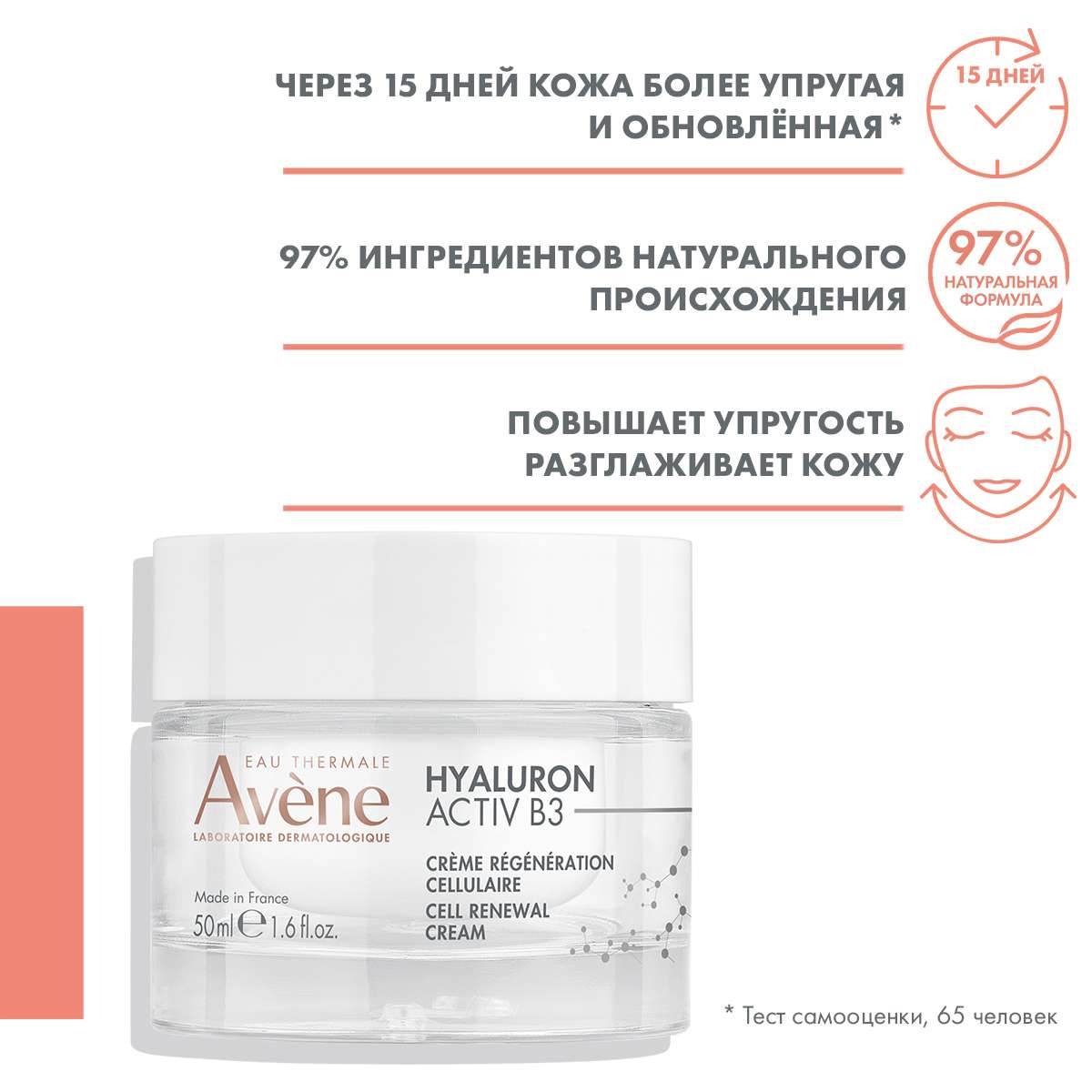 avene aqua, caprylic/capric triglyceride, glycerin, niacinamide, carthamus tinctorius seed oil, butyrospermum parkii butter, glycol palmitate, arachidyl alcohol, cetearyl alcohol, cellulose, glyceryl stearate, sodium hyaluronate, adenosine, arachidyl glucoside, behenyl alcohol, caprylyl glycol, cetearyl glucoside, citric acid, parfum, helianthus annuus seed oil, sodium benzoate, tocopherol, tocopheryl glucoside, xanthan gumДействие