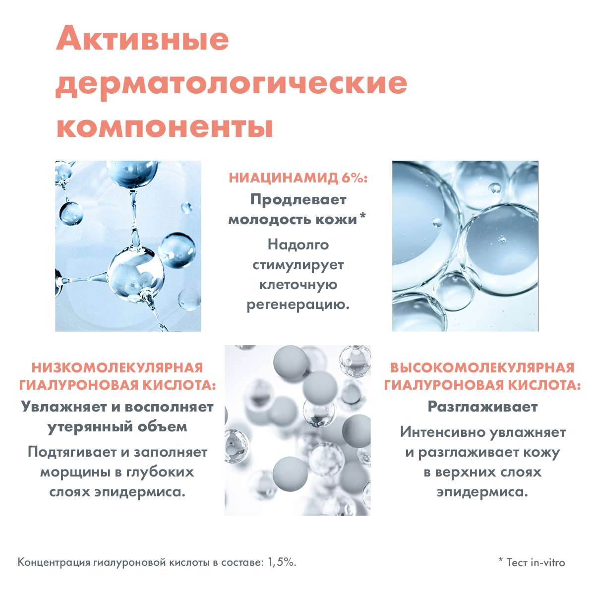 Гиалуроновая кислота 1,5% - чистая, натурального происхождения. 2 вида: высоко- и низкомолекулярная. Увлажняет, разглаживает кожу и восполняет утерянный объём.