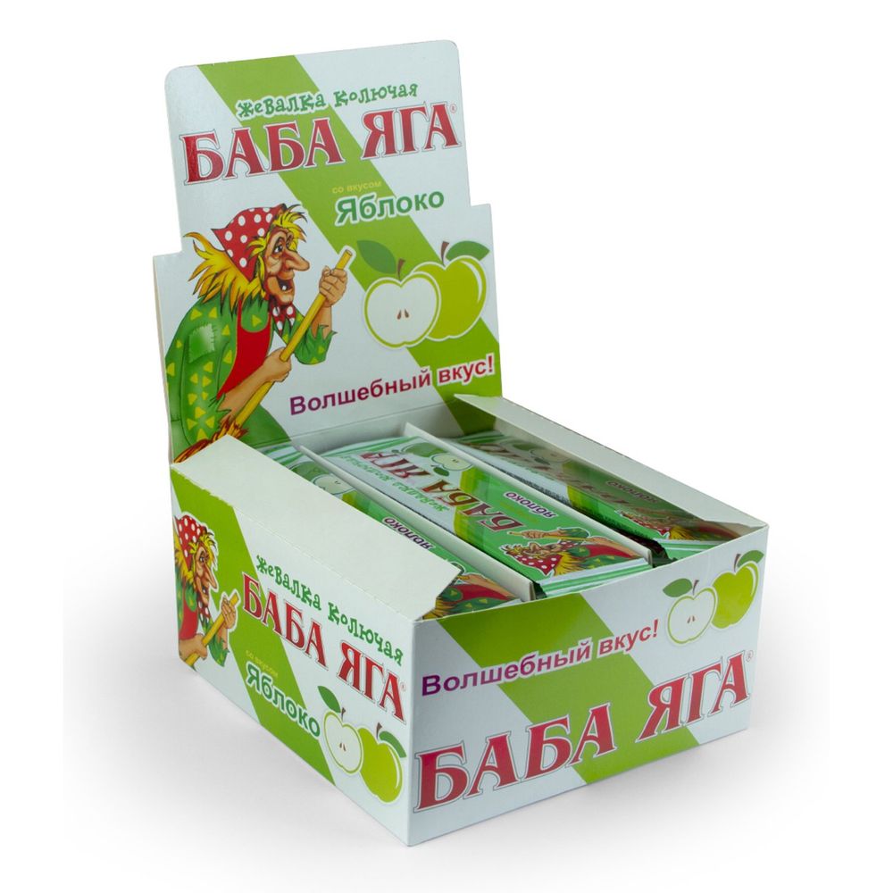 Конфета со вкусом сочного и спелого яблока производится на собственной фабрике в городе Иваново. В ее составе нет искусственных красителей, ароматизаторов и трансжиров. Каждая жевательная конфета упакована в индивидуальную упаковку с изображением Бабы-Яги. Продукт можно заказать только блоком, внутри которого 48 жевательных конфет. Такая покупка станет отличным решением для коллективного подарка, например, одногруппникам в детском саду или одноклассникам в школе. Во время детских праздников аниматоры часто устраивают конкурсы или викторины с маленькими подарочками, которые вручают детям за победы и правильные ответы. Жевательная конфета Баба Яга — прекрасный вариант для такого сладкого подарка.