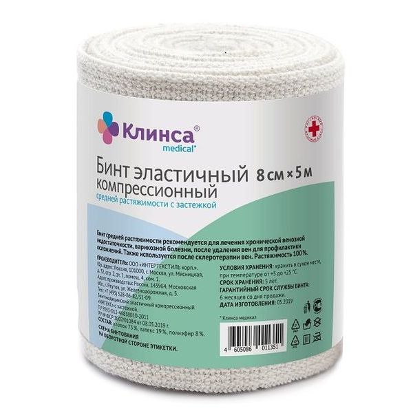 - Бинт эластичный компрессионный средней растяжимости с застежкой 8х500см Клинса