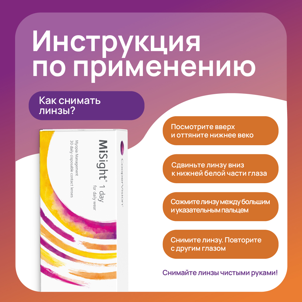 - 90 % детей смогли самостоятельно надеть и снять линзы MiSight 1 day.