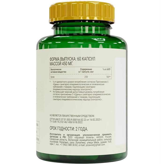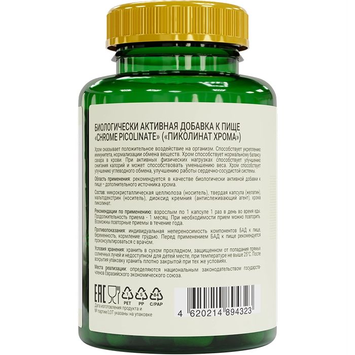 Активные вещества:микрокристаллическая целлюлоза (носитель), твердая капсула (желатин), мальтодекстрин (носитель), диоксид кремния (антислеживающий агент), хрома пиколинат.