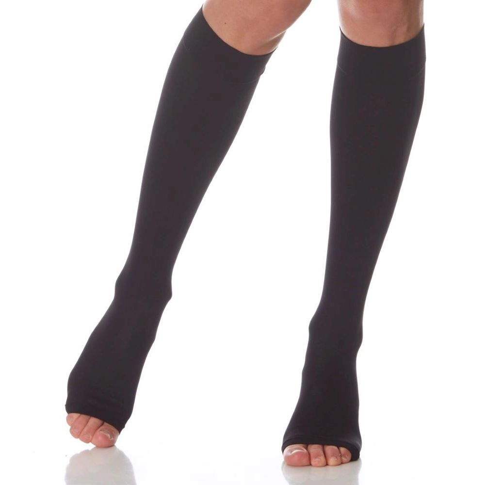 Антиварикозный трикотаж 2-го класса обладает компрессионным воздействием на подлежащие мягкие ткани (23-32 мм ртутного столба). Чулки выполнены из комбинированного синтетического материала (полиамид/эластан). Изделие имеет открытый носок.