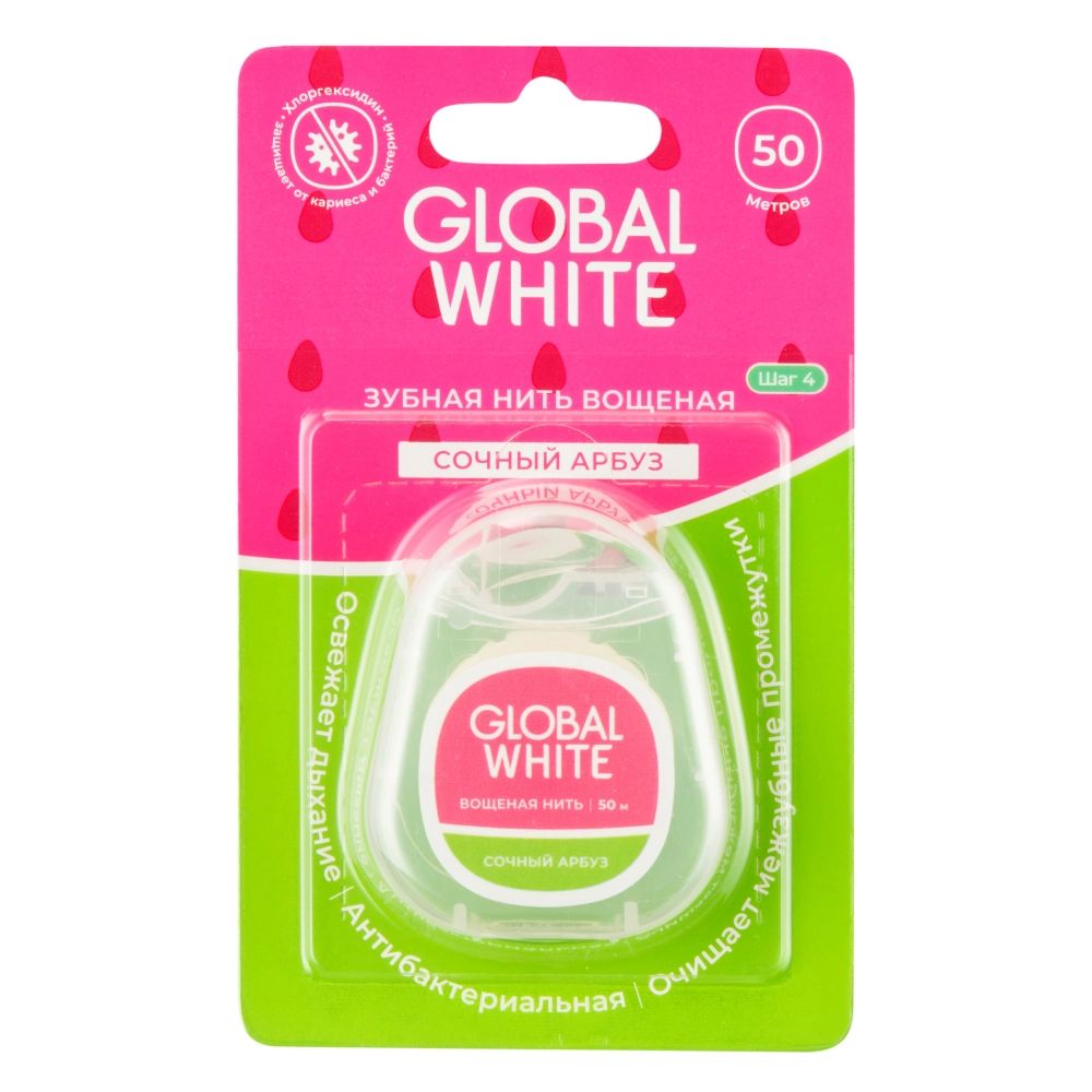 - Global white Зубная нить вощеная сочный арбуз с хлоргексидином 50м