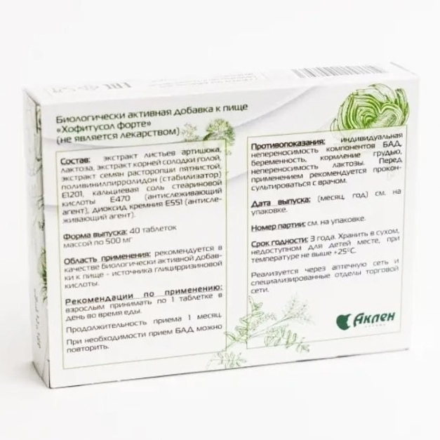 Активные вещества:Артишока полевого (Cynara scolymus L.) листьев экстракт сухой (водный) 200 мг;
