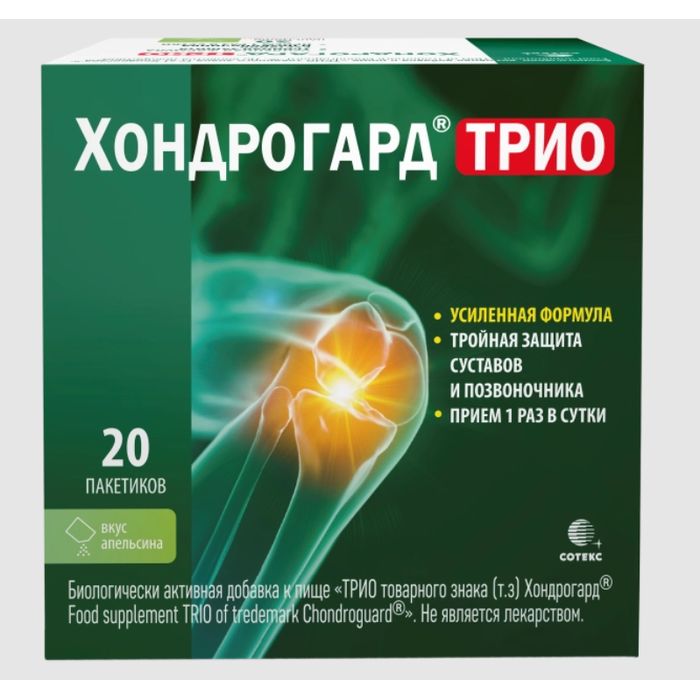 Биологически активная добавка к пище Хондрогард ТРИО - уникальная комбинация хондроитина сульфата, глюкозамина сульфата и нативного коллагена, которые способствуют защите суставного хряща от разрушения, сохранению подвижности суставов и позвоночника, восстановлению хрящевой ткани.