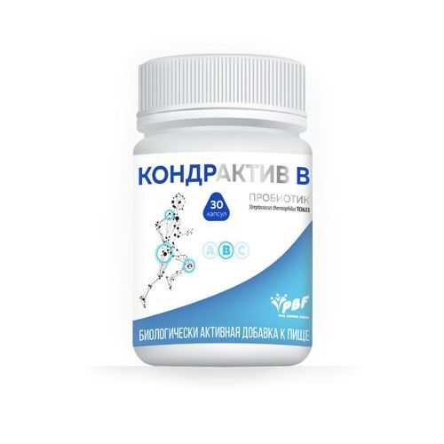 Кондрактив В содержит специальный вид микроорганизмов - Streptococcus thermophilus TCI633. Это пробиотик, способный вырабатывать гиалуроновую кислоту. Стимулирует пролиферацию клеток кожи, увеличивает содержание коллагена. Подавляет болевые ощущения, уменьшать отек суставов и воспаление синовиальной ткани и увеличивает синтез коллагена II типа в хряще.Применение