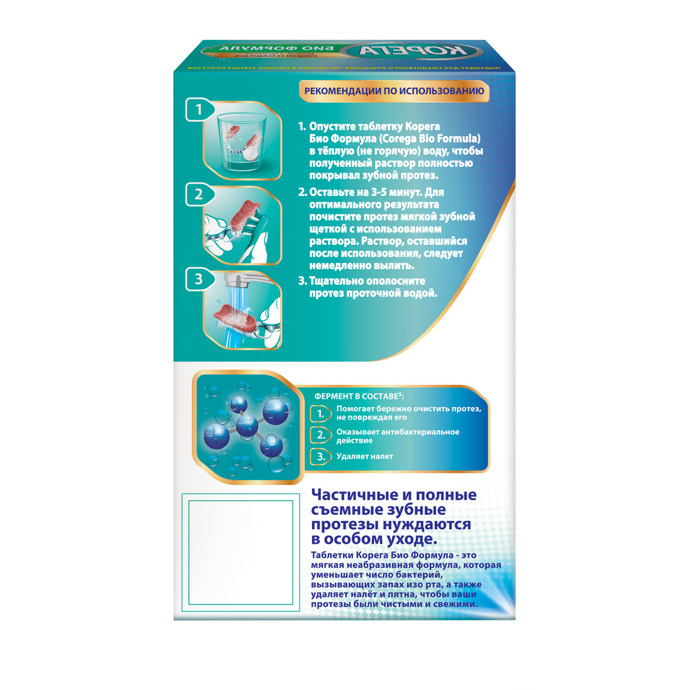 Таблетки Корега в отличие от зубных паст не содержат абразивных ингредиентов, поэтому очищают зубной протез эффективно и бережно.Рекомендации по применению