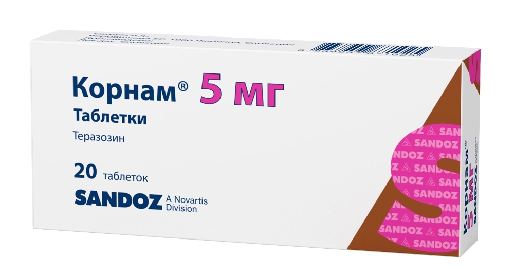 Корнам - блокатор периферических постсинаптических альфа1-адренорецепторов. Вызывает расширение артериол и венул, уменьшает общее периферическое сосудистое сопротивление (ОПСС) и венозный возврат к сердцу, оказывает антигипертензивное действие.