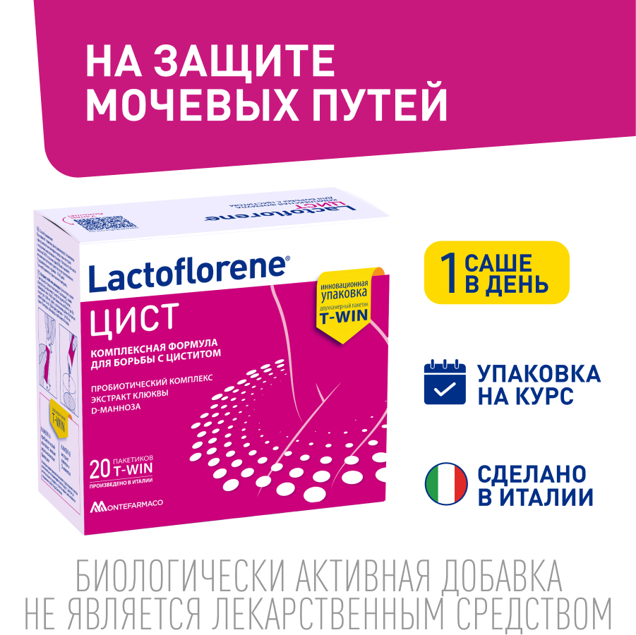Биологически активная добавка к пище Lactoflorene ЦИСТ – комплексная формула для борьбы с циститом, в состав которой включены пробиотики, растительные экстракты и D-манноза, которые способствуют уменьшению болей и резей при мочеиспускании, снижению риска появления ИМП и дискомфорта от их проявлений. Lactoflorene ЦИСТ воздействует на причину возникновения ИМП – дисбактериоз, способствует выведению возбудителей инфекции и заботится о здоровье всей системы в целом. Живые молочнокислые бактерии с их пробиотическим действием помогают восстановить баланс кишечной флоры. Экстракт клюквы, богатый проантоцианидинами, способствует правильному функционированию мочевыделительной системы. D-манноза – это простой сахар, экстрагируемый из березы, который медленно усваивается, и за счет этого достигает почек и мочевого пузыря, где связывает бактерии-возбудители инфекций E.Coli и способствует их выведению с мочой. Таким образом, Lactoflorene ЦИСТ можно использовать как при заболеваниях мочевыводящих путей, так и для снижения риска их развития.