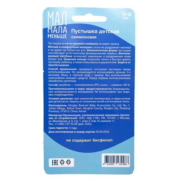 - Мал Мала Меньше Соска-пустышка силиконовая 0-6 месяцев голубые №2