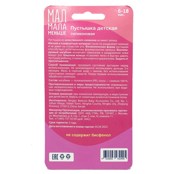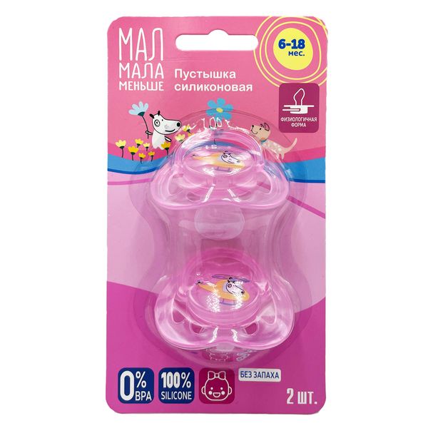 - Мал Мала Меньше Соска-пустышка силиконовая 6-18 месяцев розовые №2