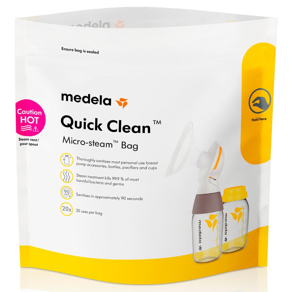 Пакеты Quick Clean Medela для паровой бытовой стерилизации в свч, 5 шт. в упаковке. Каждый пакет обеспечивает 20 циклов стерилизаций. Быстрая и надежная домашняя стерилизация любых принадлежностей для грудного вскармливания.