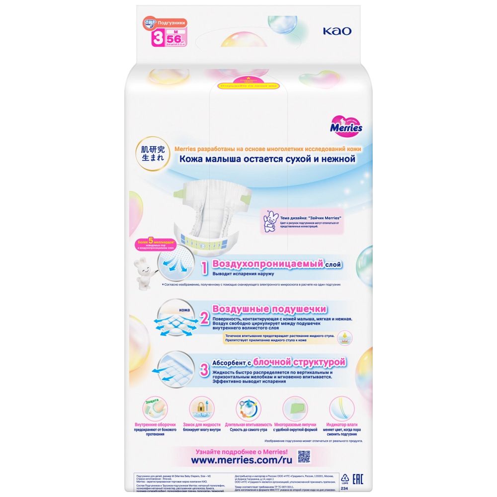 MERRIES ПОДГУЗНИКИ ДЕТСКИЕ для малышей с весом 6-11 кг (размер М, 3 ) созданы с особенной заботой о коже и комфорте Вашего ребёнка.