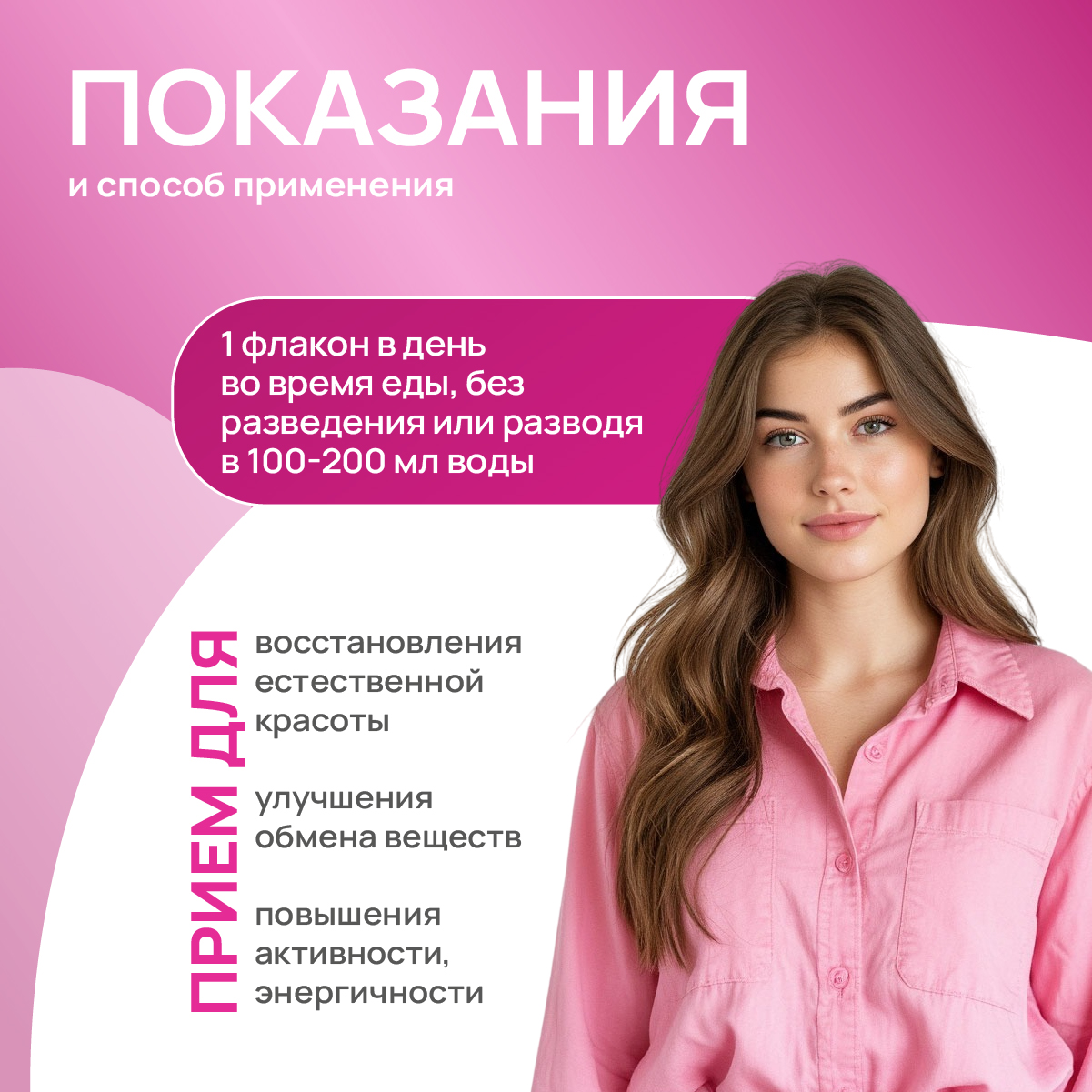 Вода, концентрат апельсинового сока, гидролизат коллагена (из говядины) (11%), стабилизатор глицерин, концентрат сока маракуйи, подкислитель лимонная кислота, экстракт плодов оливы, содержащий гидрокситирозол (из Olea europaea) (0,8%), L-аскорбат натрия, гиалуронат натрия (0,6%), коэнзим Q10 (0,05%), консервант сорбат калия, DL-альфа-токоферилацетат, сульфат цинка, селенат натрия, подсластители ацесульфам К и сукралоза, ароматизатор, D-биотинПрименение