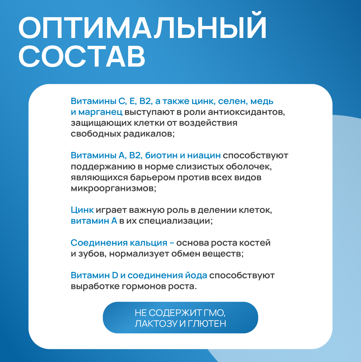 Рекомендуется в качестве биологически активной добавки к пище для детей - дополнительного источника витаминов (C, E, Д3, А, К1, В1, В2, В6, В12, никотинамида, фолиевой кислоты, пантотеновой кислоты), минеральных веществ (железа, меди, йода, хрома, марганца, молибдена), источника бета-каротина, содержащей магний, цинк, селен.Противопоказания