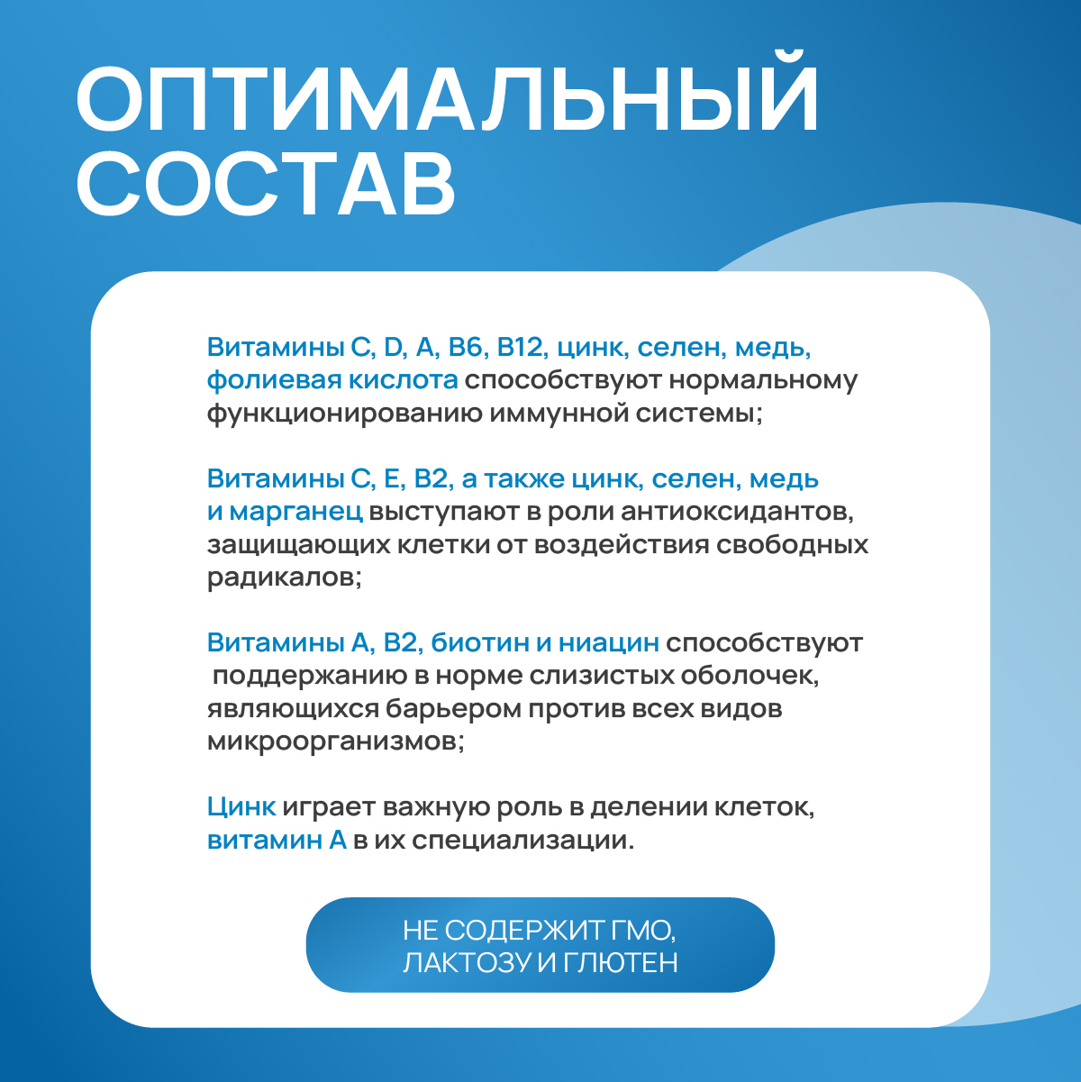 Активные вещества:Подсластитель сахарин натрия, Natrium-L-ascorbat, бета-каротин, стабилизатор гумми арабикум, Витамин Е, никотинамид, Витамин В6 гидрохлорид, модифицированный крахмал, мальтодекстрин, Витамин В2, D - биотин, Витамин А - ацетат, Витамин К1, сульфат меди, экстракт томатов, Декстроза, обогащенный ликопином, Витамин В12, кальция - D - пантотенат, селенат натрия, L - аскорбиновая кислота, Витамин D3, хлорид хрома (III), ароматизатор, глюконат железа, сульфат марганца, эмульгатор соевый лецитин, подкислитель лимонная кислота, эмульгатор сложный эфир сахарозы пищевых жирных кислот, лютеин, йодид калия, экстракт цитрусовых, молибдат натрия, Витамин В1 - мононитрат, глюконат цинка