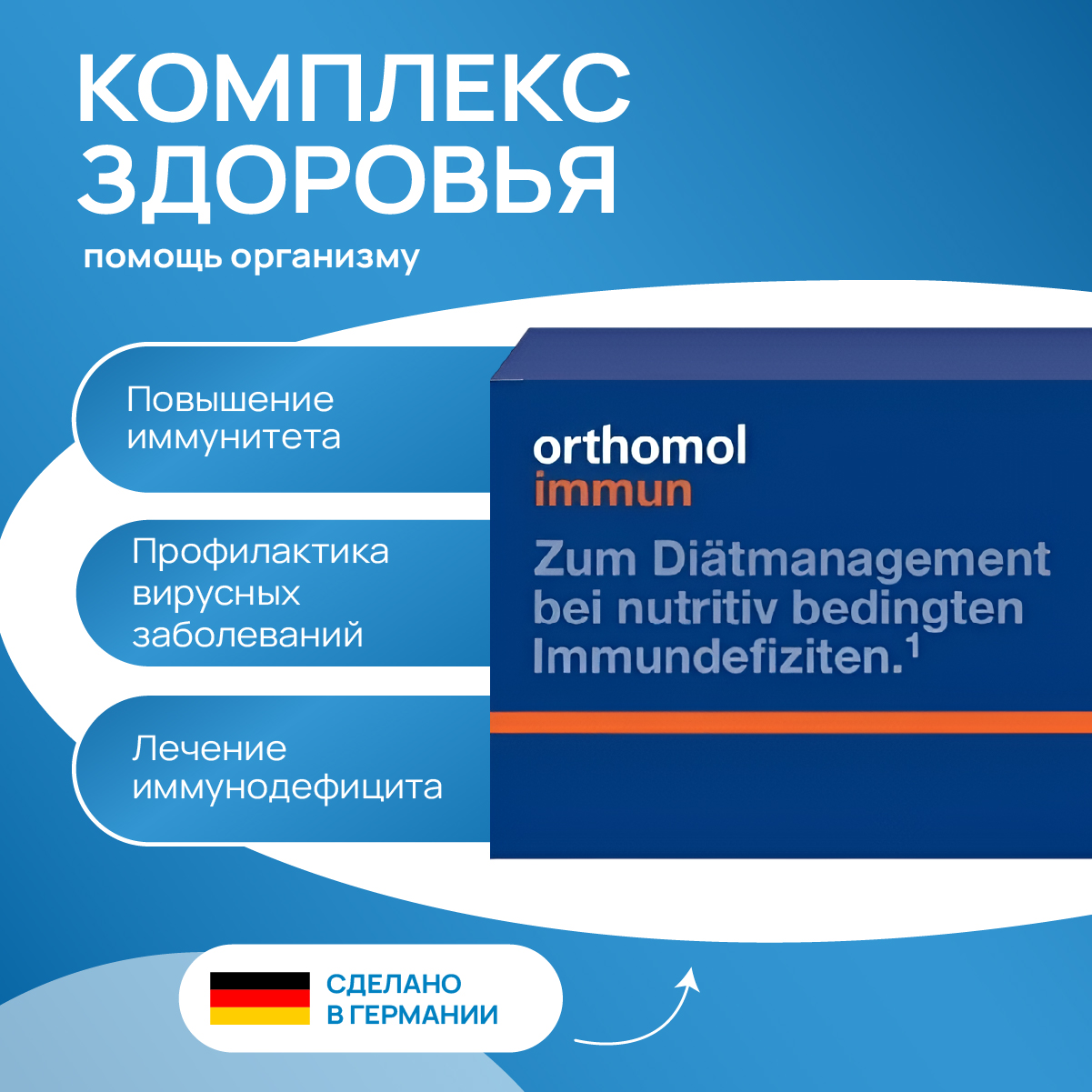 Если у вас гиперфункция щитовидной железы (гипертиреоз), перед приемом препарата обязательно проконсультируйтесь со своим лечащим врачом. Это абсолютно безопасно и безвредно. Ортомол Иммун не предназначен для замены другой медикаментозной терапии или назначений врача. Каждая упаковка Orthomol Immun рассчитана на 30 дней приема. Возможно изменение нормального цвета мочи, что является следствием воздействия витамина В2. Ортомол Иммун следует принимать под наблюдением врача. Разведите содержимое пакетика в 100-150 мл негазированной воды или фруктового сока, размешайте и выпейте во время еды или сразу после. Если у вас нарушена толерантность к глюкозе, во время приема требуется тщательно следить за обменом веществ. Orthomol Immun не является заменителем пищи. Ортомол Иммун имеет ряд противопоказаний, поэтому его необходимо принимать после консультации со специалистом. Для достижения наилучших результатов рекомендован длительный прием Orthomol Immun. Препарат Ортомол Иммун употребляется в качестве расширенной сбалансированной диеты и не является полноценным пищевым продуктом. Надежная поддержка защитных сил организма обеспечивается только при длительном приеме Orthomol Immun. Дневная доза состоит из пакетика с порошкомНаличие и цена товара в аптеках