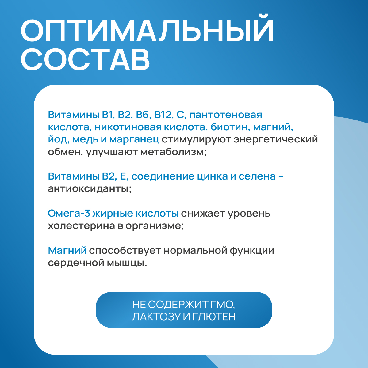 Дополнительный источник таурина, полифенолов, дополнительного источника витаминов A, D3, Е, С, В1, В2, В6, В12, никотинамида, пантотеновой кислоты, фолиевой кислоты, биотина, магния, цинка, марганца, меди, селена, хрома, молибдена содержащей йод. лизин, ПНЖК Омега-3Противопоказания