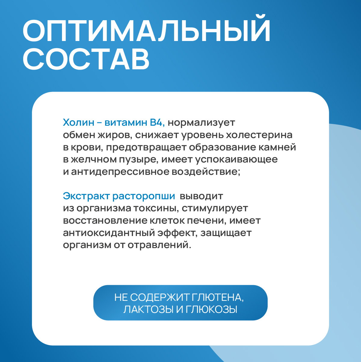 Активные вещества: Холина битартрат (46%), экстракт расторопши пятнистой с силимарином (из Silybum marianum ) (29%), глазирователь гидроксипропилметилцеллюлоза, разделительный агент магниевые соли жирных кислот, разделительный агент диоксид кремния.