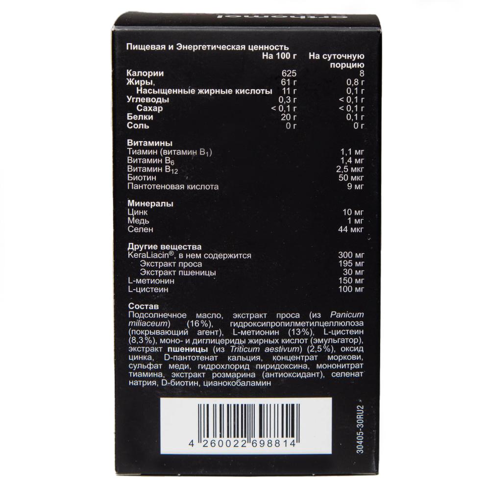 подсолнечное масло, экстракт проса (из Panicum miliaceum ) (25%), глазурь, гидроксипропилметилцеллюлоза, L-метионин (13%), L-цистеин (8,3%), эмульгатор моно- и диглицеридов жирных кислот, экстракт пшеницы (из тритика) aestivum ), оксид цинка, D-пантотенат кальция, морковный концентрат, сульфат меди, гидрохлорид пиридоксина, мононитрат тиамина, экстракт розмарина (от Rosmarinus officinalis ), селенат натрия, D-биотин, цианокобаламин.Применение