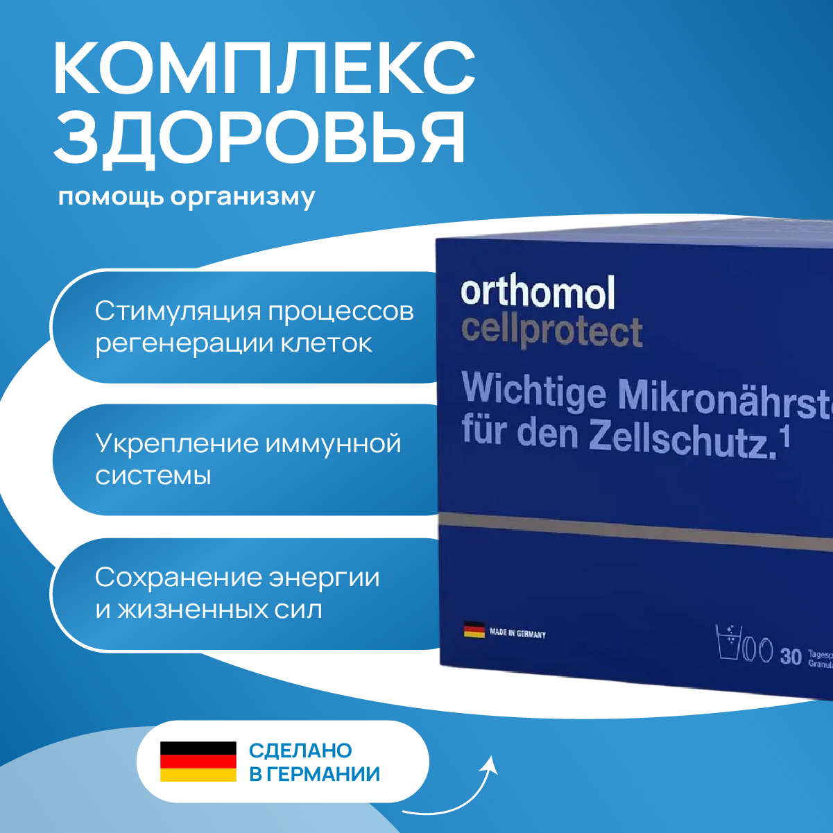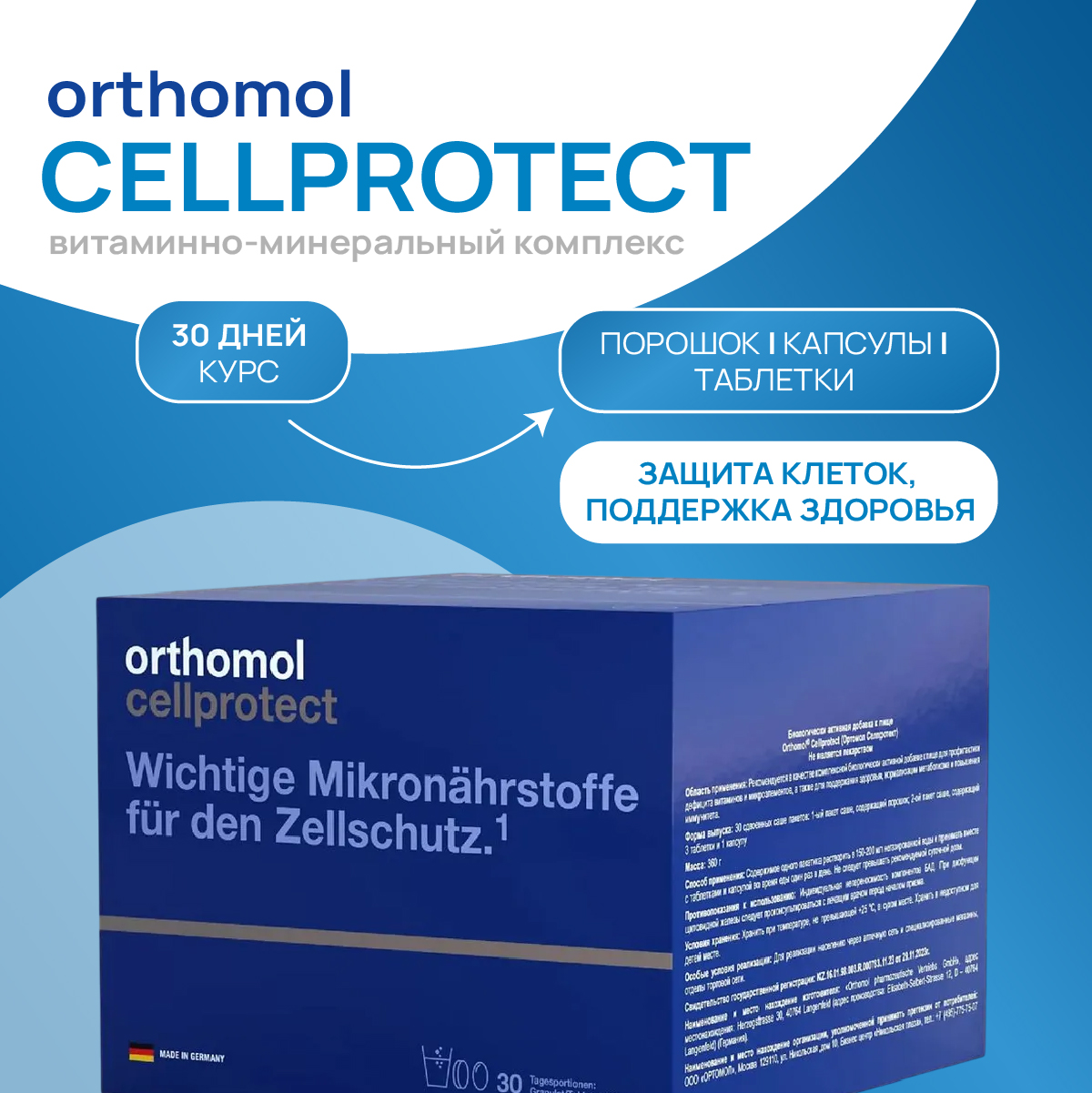 Orthomol Cellprotect - комплекс витаминов, минералов, вторичных растительных веществ и омега-3-жирных кислот, направленный на защиту клеток, их омоложение и восстановление. Не является лекарственным средством.
