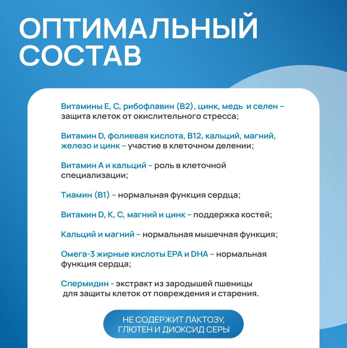 Активные вещества: устойчивый кукурузный декстрин, лактат кальция, декстроза, подкислитель лимонная кислота, экстракт зародышей пшеницы с высоким содержанием спермидина 5,9%) карбонат магния, рыбий жир 3,3%, сахароза, концентрат свекольного сока, наполнитель микрокристаллическая целлюлоза, желатин из говядины, L-аскорбиновая кислота, ароматизатор, полифенолсодержащий экстракт виноградных косточек 0,8%, увлажнитель глицерин, глюконат железа, глюконат цинка, краситель из моркови, глазирующий агент гидроксипропилметилцеллюлоза, антиадгезив кремний. диоксид, DL-альфа-токоферилацетат, стабилизатор полидекстроза, краситель карбонат кальция, коэнзим Q 10 0,1%, антислеживатель жирных кислот, никотинамид, подсластитель сукралоза, эмульгатор соевый лецитин, эмульгатор моно- и диглицериды жирных кислот, увлажнитель сорбит, антислеживатель магниевых солей жирных кислот, подсластитель ацесульфам К, D-пантотенат кальция, антислеживатель тальк, сульфат меди, тиамина гидрохлорид, краситель оксиды железа, пиридоксина гидрохлорид, бета-каротин, рибофлавин, птероилмоноглутаминовая кислота, ретинил ацетат, йодид калия, хлорид хрома (III), филлохинон, D-биотин, селенат натрия, холекальциферол, цианокобаламин.