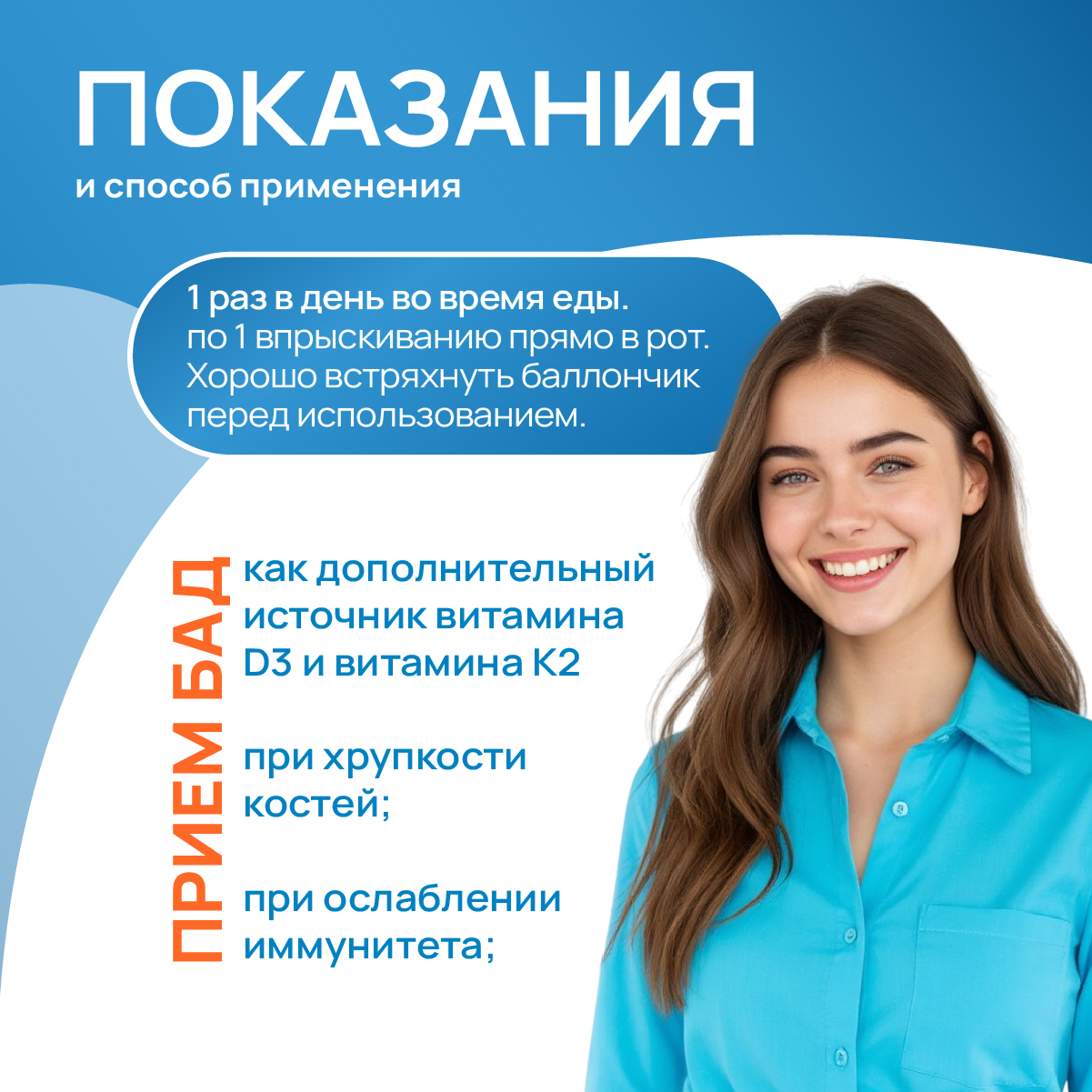 Раз в сутки по 1 впрыскиванию прямо в рот во время еды. Рекомендуется хорошо встряхнуть баллончик перед каждым использованием. При первом использовании прокачайте три раза, чтобы заполнить распылительную головку. Регулярно очищайте распылительную головку (например, вытирая ее насухо).Особые указания