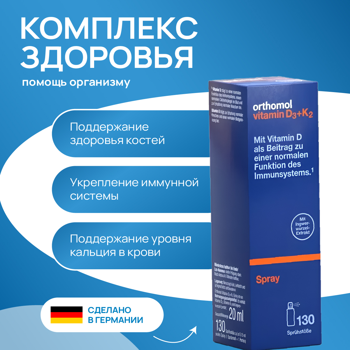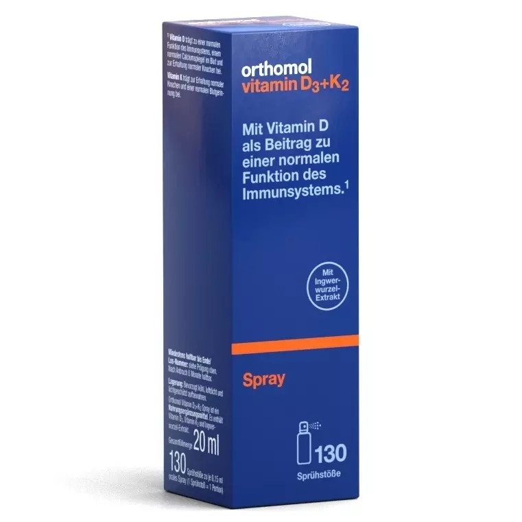 Спрей Orthomol® Витамин D3+K2 рекомендуется в качестве дополнительного источника витамина D3 и витамина K2. Orthomol® Витамин D3+K2 также содержит экстракт имбиря и имеет вкус апельсина и мяты.Витамин D способствует улучшению функции иммунной системы, нормализации уровня кальция в крови и поддержанию здоровья костей.
